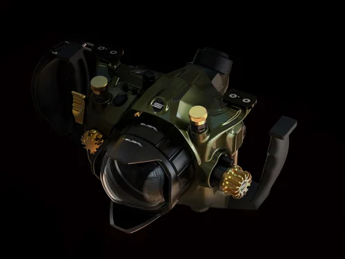 Underwater housing for Sony Alpha 7 MK II shown in “Green Monster” custom color.